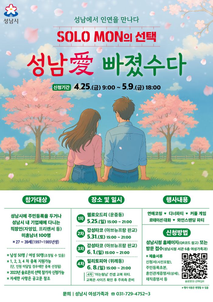 경기 성남시는 오는 25일부터 5월 9일까지 '솔로몬(SOLO MON)의 선택' 올해 상반기 행사 참가자 400명(남·여 각 200명)을 모집한다고 22일 밝혔다.
