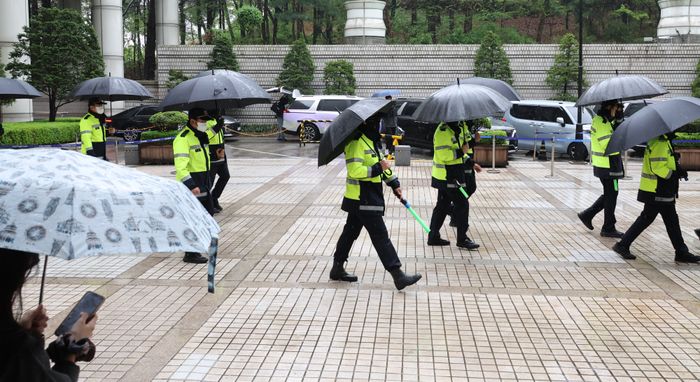 22일 서울 서초구 서울중앙지법에서 경찰이 이재명 더불어민주당 대선 예비후보의 공판 출석을 앞두고 경계를 강화하고 있다. ⓒ연합뉴스