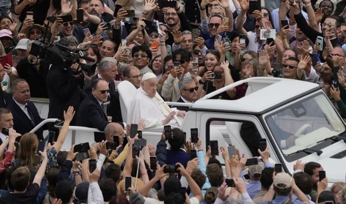 지난 20일 바티칸의 성베드로 광장에서 프란치스코 교황이 부활절 미사를 마친 뒤 대중들에 둘러싸인 채 인사를 전하고 있다. ⓒ AP/연합뉴스