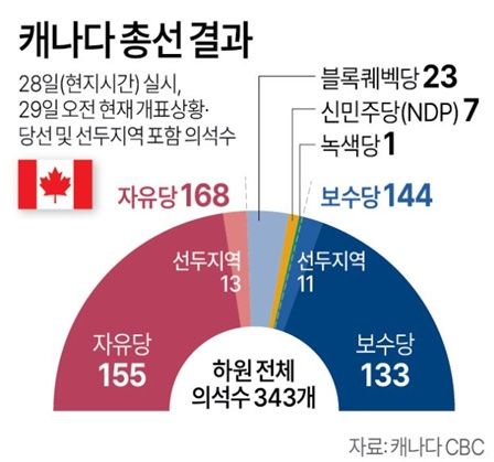 캐나다 공영방송 CBC방송 등에 따르면 자유당은 이날 총선에서(98.7% 개표 기준) 43.5%를 득표해 보수당(41.4%)을 누르고 승리했다. 다만 현재까지 확보 추정 의석 수는 168석인 만큼 단독 과반 의석(총 343석 중 172석) 확보는 어려울 전망이다.