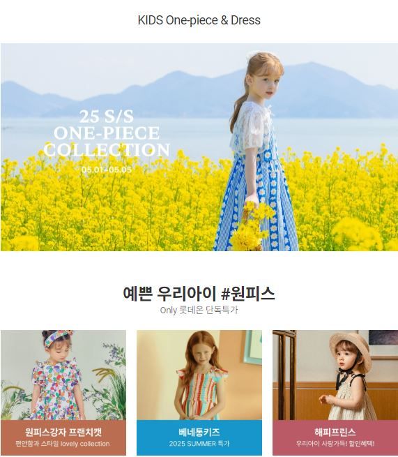 추천 상품으로는 ‘베네통키즈 집업 피케 원피스’ ‘베베쥬 신상원피스’, ‘프렌치캣 나염 원피스’ 등이 있다.
