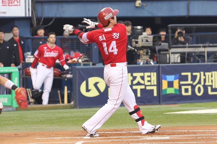 3번 지명타자로 선발 출전한 최정은 1회 1사 1루 상황에서 상대 손주영의 직구를 그대로 잡아당겨 왼쪽 펜스를 넘어가는 결승 투런 포를 쏘아 올렸다.