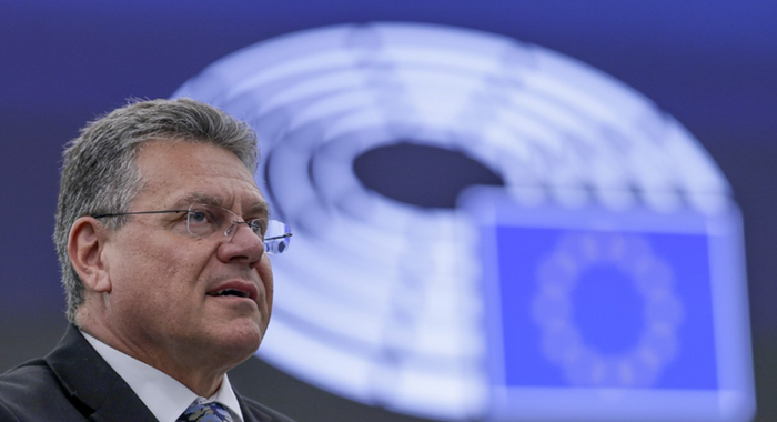 마로시 셰프초비치 유럽연합(EU) 무역·경제안보 담당 집행위원이 6일(현지시간) 프랑스 스트라스부르에서 열린 본회의에 참석해 발언하고 있다. ⓒEPA/연합뉴스