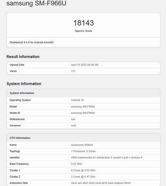 삼성 갤럭시 Z폴드 7으로 추정되는 제품의 모델명(SM-F966U)이 기기 성능 테스트 사이트인 '긱벤치'에 등록됐다. 긱벤치에 따르면 갤럭시 Z폴드 7에 퀄컴의 AP가 적용된다. ⓒ긱벤치