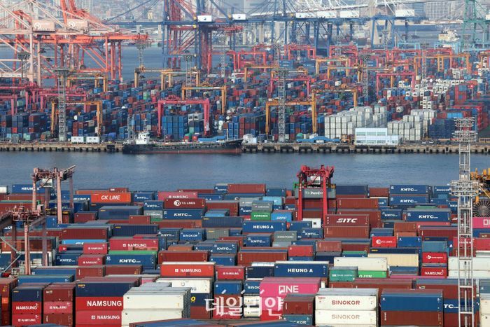 지난 1일 부산 남구 신선대(사진 아래) 및 감만(위) 부두 야적장에 수출입 컨테이너가 가득 쌓여 있다.ⓒ뉴시스