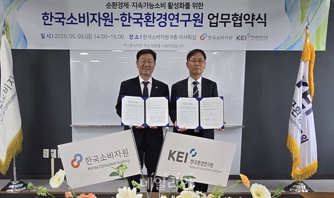 한국환경연구원(KEI, 원장 김홍균)은 9일 한국소비자원과 ▲탄소중립 실현 ▲순환경제 활성화 ▲제품 수리권 촉진을 위한 상호 정보교류·협력을 위한 업무협약을 연장했다.