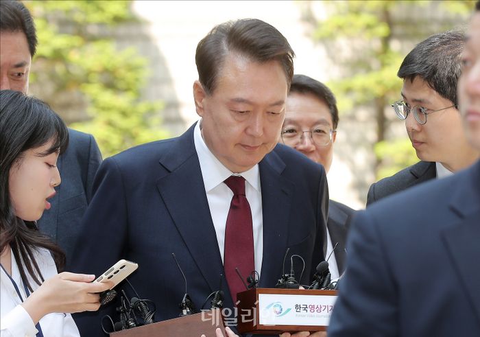 내란 우두머리 혐의로 재판에 넘겨진 윤석열 전 대통령이 12일 오전 서울 서초구 서울중앙지법에서 열린 세 번째 공판에 출석하고 있다.