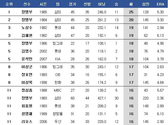 KBO 한 시즌 최다패 투수 순위. ⓒ 데일리안 스포츠