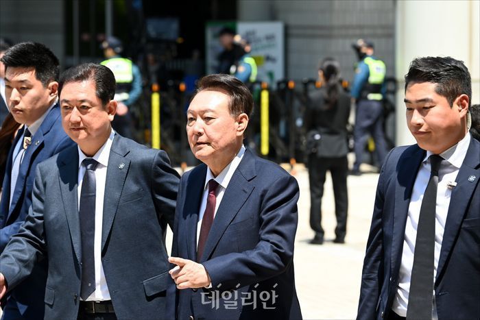 윤석열 전 대통령이 12일 서울 서초구 중앙지방법원에서 열린 내란 우두머리 혐의, 직권남용 권리행사방해 혐의 사건 3차 공판에서 오전 재판 종료 후 식사를 위해 나서다 취재진의 질문에 묵묵부답으로 일관하고 있다. ⓒ사진공동취재단