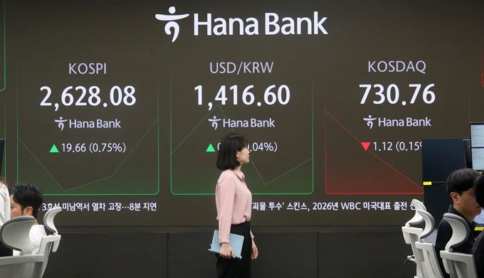 14일 서울 중구 하나은행 딜링룸 현황판에 코스피·코스닥 지수 등이 표시돼 있다. ⓒ뉴시스