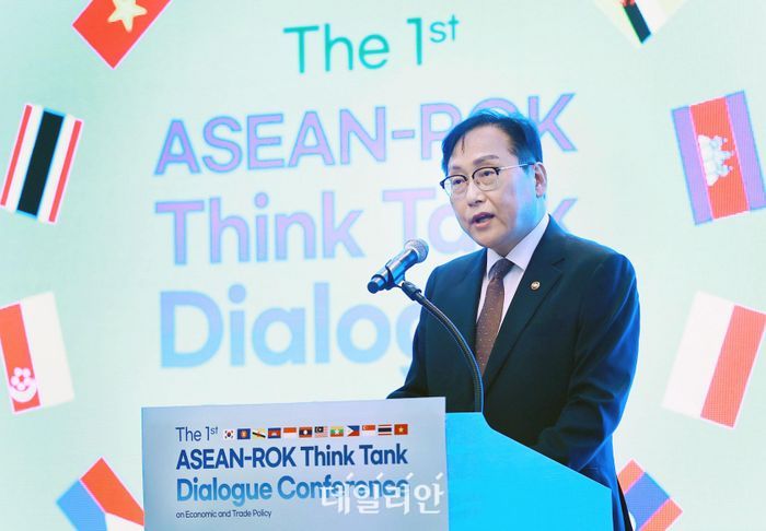 정인교 산업통상자원부 통상교섭본부장이 14일 제주 서귀포시 제주롯데호텔에서 열린 제1차 한-아세안 경제·통상 싱크탱크 다이얼로그 컨퍼런스에 참석해 환영사를 하고 있다.ⓒ뉴시스