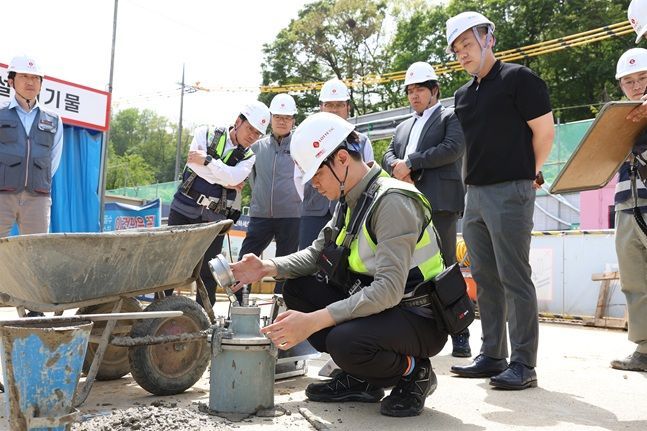 롯데건설 직원이 서초 헌인마을 현장에서 차세대 혼화제가 적용된 콘크리트를 테스트하고 있다. ⓒ 롯데건설