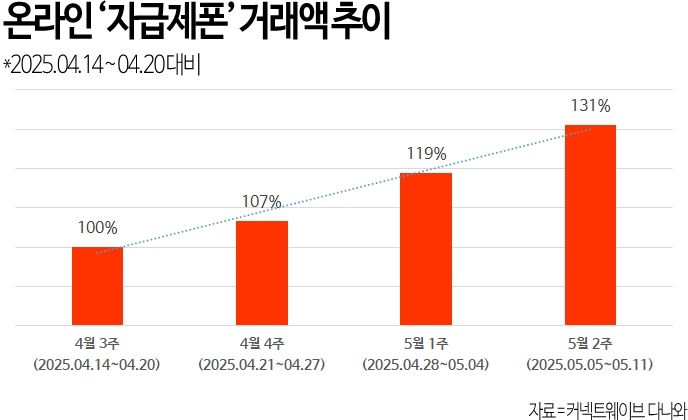다나와가 집계한 자료에 따르면, 지난 5월 2주(2025.5.5~5.11) 자급제폰 거래액은 해킹 사건이 있기 전인 4월 3주(2025.4.14~4.20)대비 31% 상승했다.