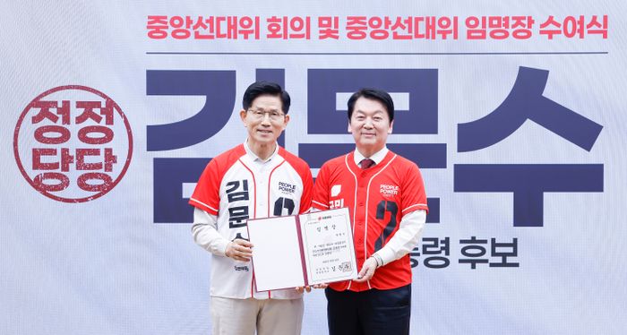 김문수 국민의힘 대선 후보가 12일 서울 영등포구 여의도 국민의힘 중앙당사에서 열린 중앙선대위 임명장 수여식에서 안철수 공동선거대책위원장에게 임명장을 수여하고 있다. ⓒ공동취재