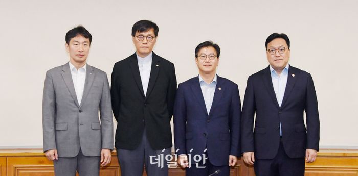 (왼쪽부터) 이복현 금융감독원장, 이창용 한국은행 총재, 김범석 기획재정부 장관 직무대행, 김병환 금융위원장이 16일 오전 서울 중구 은행회관에서 열린 거시경제·금융현안 간담회에 앞서 기념촬영을 하고 있다.ⓒ기획재정부