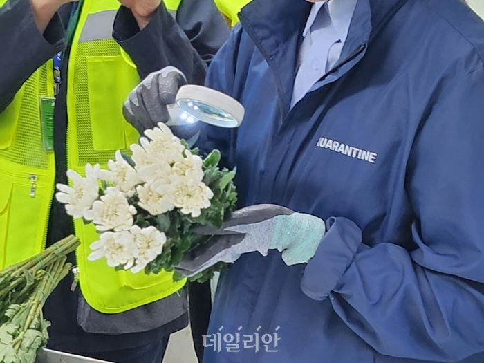 수입식물 검역 장소에서는 중국산 국화절화 한다발을 돋보기로 직접 확인했다. 이후 하얀 천 위에 꽃을 털어 병해충, 이물질 등이 있는지 확인했다. 중국산 마늘종도 갈변 등 여부를 화인하고 의심이 가는 샘플은 직접 꽃봉오리를 칼로 갈라 확인했다.