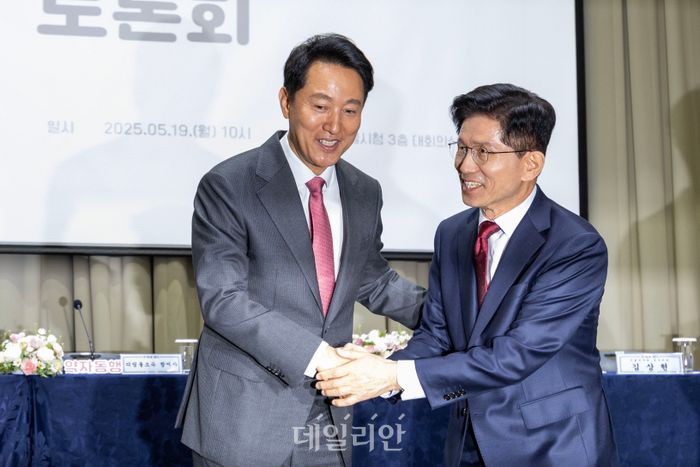 오세훈 서울시장과 김문수 국민의힘 대선 후보가 19일 오전 서울시청에서 열린 약자와 동행하는 서울 토론회에 참석해 악수하고 있다.