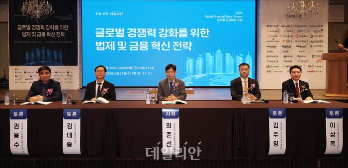 김주영 법무법인 한누리 대표 변호사(왼쪽서 네번째)가 21일 서울 여의도 CCMM빌딩에서 ‘글로벌 경쟁력 강화를 위한 법제 및 금융 혁신 전략’을 주제로 열린 ‘데일리안 2025 글로벌 금융비전 포럼’에서 토론을 하고 있다. 왼쪽부터 권용수 건국대 KU글로컬혁신대학 교수, 김대종 세종대 경영학부 교수, 최준선 성균관대 법학전문대학원 명예교수, 김 변호사, 이상목 소액주주 플랫폼 액트 대표.ⓒ데일리안 홍금표 기자