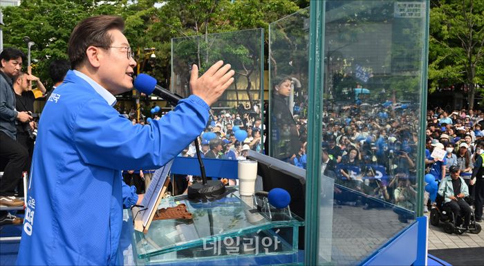 이재명 후보는 21일 인천 부평구 집중 유세 현장에서 "방탄유리를 설치하고 경호원들의 경호 속에 유세를 해야하는 것이 나와 민주당의 잘못이냐"라며 "그들이 이렇게 만들지 않았느냐"라고 주장했다.
