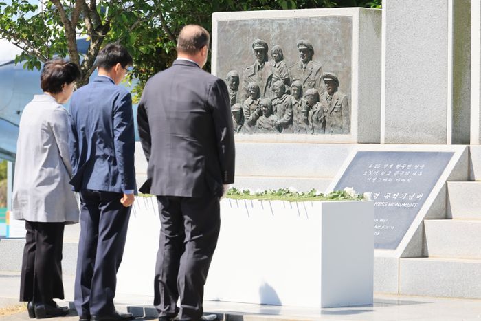 9일 오전 제주 서귀포시 안덕면 항공우주박물관에서 열린 '딘 헤스 미 공군대령 9주기 추모행사'에서 참석자들이 헌화하고 있다. ⓒ연합뉴스