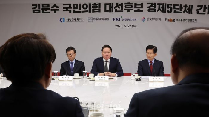 최태원 대한상의 회장이 22일 오전 서울 중구 대한상공회의소에서 열린 경제 5단체장 간담회에서 발언하고 있다.