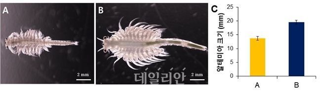 그 결과 암조건에서 배양한 미세조류를 먹인 알테미아는 광조건보다 몸길이가 약 1.4배 더 커졌다. 생존율도 높아졌다.