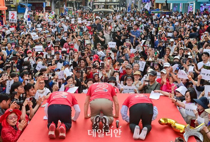 김문수 국민의힘 대선 후보가 시민들에게 큰절을 하고 있다. ⓒ데일리안 방규현 기자