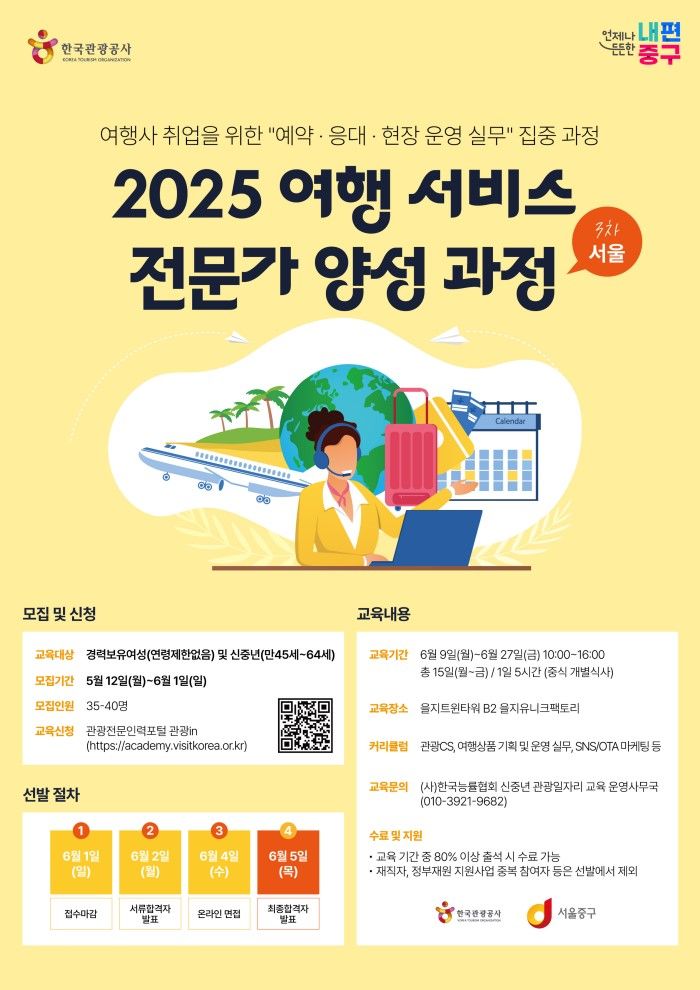 서울 중구가 한국관광공사와 공동으로 6월 9일(월)부터 27일(금)까지 여행서비스 전문가 양성과정을 운영한다고 23일 밝혔다. 여행서비스 전문가는 여행상품 기획과 마케팅, 고객응대 등 여행업 업무 전반을 수행한다.