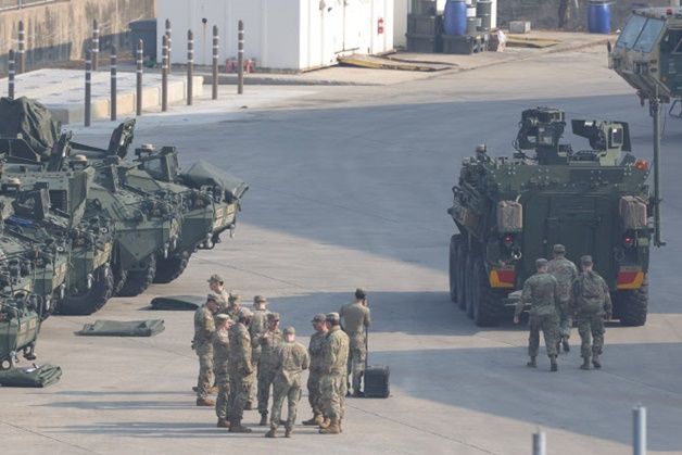 한반도 방어를 위한 한·미 정례 연합훈련인 ‘자유의 방패’(FS·Freedom Shield) 연습이 시작된 지난 3월10일 경기도 동두천시 주한미군 기지에서 스트라이커 장갑차가 대기하고 있다. ⓒ 연합뉴스