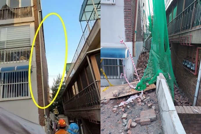 소방 당국에 따르면 건물 외벽에 부착된 마감재 벽돌이 내벽에서 분리돼 무너졌으며, 벽돌은 수원시가 사전에 설치한 안전망 안으로 쏟아진 상태였다.