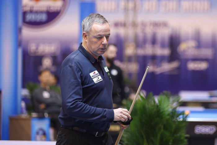 ‘2025 호치민 3쿠션 월드컵’ 정상을 차지한 딕 야스퍼스(네덜란드)가 신중하게 다음 공을 생각하고 있다.