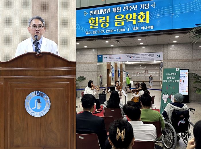 이 택(왼쪽) 인하대 병원장이 개원 29주년 기념식에서 인사말을 하고 있다. 우측 사진은 병원 로비에서 열린 힐링 음악회 장면. ⓒ인하대 병원 제공