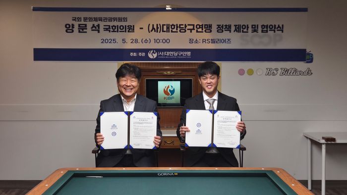 대한당구연맹(회장 서수길)은 28일 양문석 국회의원(국회 문화체육관광위원회, 경기 안산시갑)과 당구 종목의 제도적 기반 조성과 산업 생태계 활성화를 위한 정책협약을 체결했다고 밝혔다.