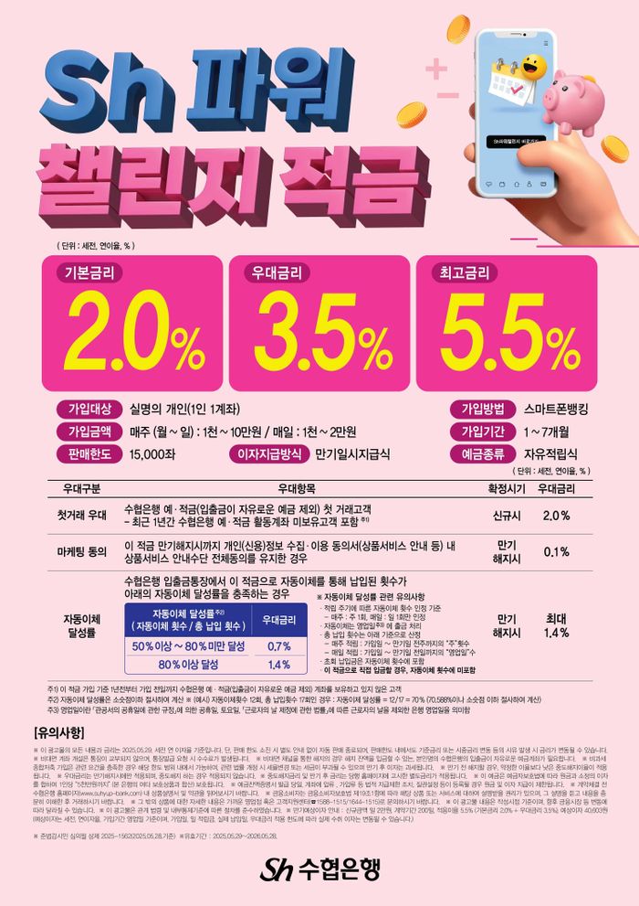 Sh수협은행은 일상의 소소한 재미와 행복을 느낄 수 있는 고객 생활패턴 맞춤형 'Sh파워챌린지적금'을 신규 출시한다고 29일 밝혔다.