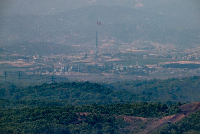 경기도 파주시 접경지역에서 바라본 서부전선 비무장지대(DMZ)에서 북한 기정동의 인공기가 펄럭이고 있다. ⓒ연합뉴스