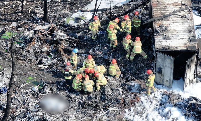 29일 오후 1시 50분께 경북 포항시 남구 동해면 신정리 한 야산에 해군 초계기가 추락한 가운데 소방 관계자들이 탑승자 수색을 하고 있다. ⓒ연합뉴스