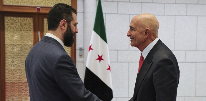 29일(현지시간) 도널드 트럼프 미국 대통령의 시리아특사인 톰 배럭(오른쪽) 주튀르키예 미국 대사가 다마스쿠스에서 아메드 알샤라 시리아 임시대통령은 만나고 있다. ⓒAP/연합뉴스