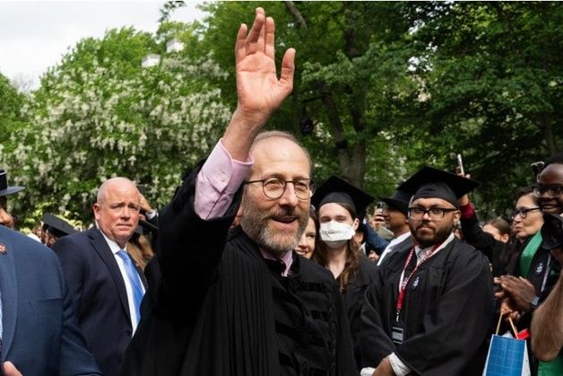 앨런 가버 미국 하버드대 총장이 29일(현지시간) 미 매사추세츠주 케임브리지 하버드 캠퍼스에서 열린 374회 졸업식 축사를 하기 위해 연단에 오르기 전 손을 흔들고 있다. ⓒ 뉴시스