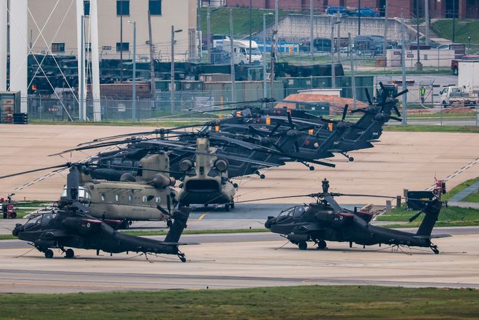 경기 평택시 캠프 험프리스에 주한미군 아파치 헬기와 시누크 헬기가 세워져 있다. ⓒ 뉴시스