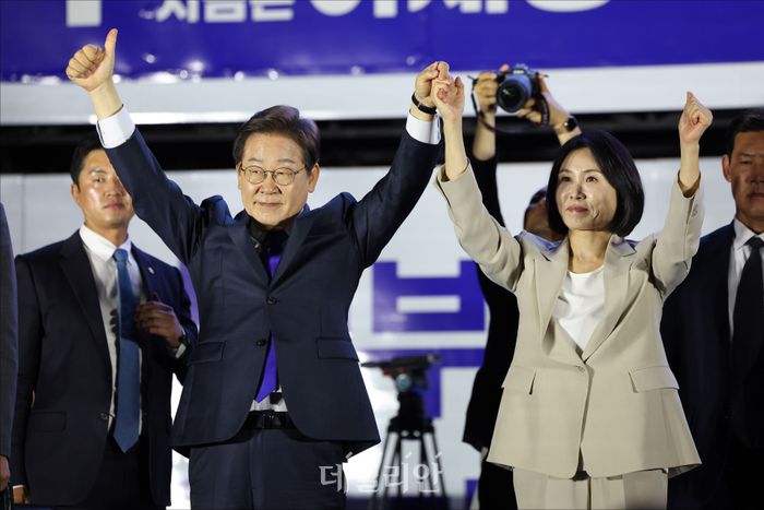 21대 대선에서 당선이 확실시 되고 있는 이재명 더불어민주당 대선 후보가 4일 서울 여의도 국회 일대에서 열린 국민 개표방송 행사에서 배우자 김혜경 여사와 함께 감사 인사를 하고 있다. ⓒ데일리안 홍금표 기자