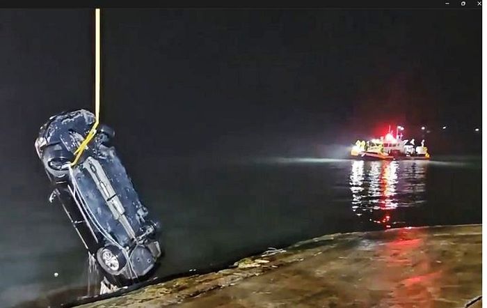 지난 2일 전남 진도군 진도항 선착장에서 해상으로 추락한 차량이 인양되던 모습.ⓒ목포해양경찰서 제공