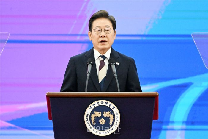 이재명 대통령이 4일 오전 서울 여의도 국회 로텐더홀에서 제21대 대통령 취임선서를 마친 뒤 취임사를 하고 있다.