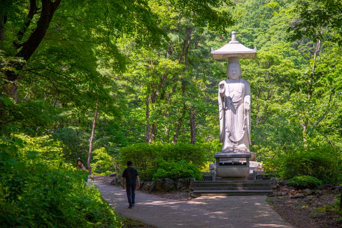 폭포와 굴 앞에 나무 계단이 이어진다. 계단은 모두 108개다. 계단을 모두 오르면 금강문이고 그 너머가 바로 원효대사가 수행했다는 원효대다.