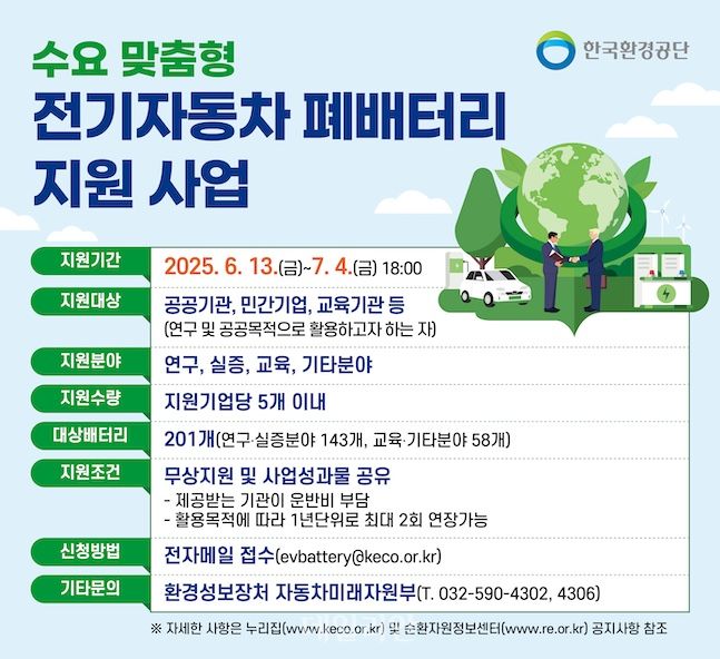 한국환경공단(이사장 임상준)은 오는 13일부터 ‘2025년 수요 맞춤형 전기자동차 폐배터리 무상지원사업’ 신청서를 접수한다.
