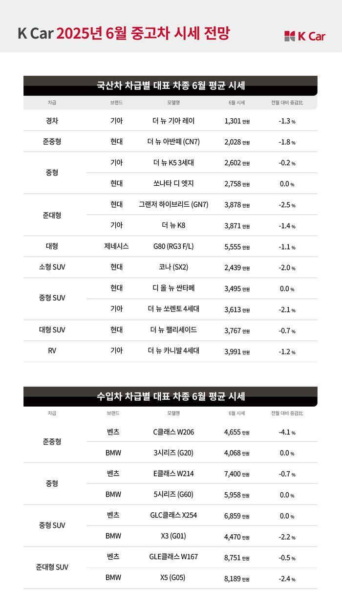 8일 중고차 플랫폼 업체 케이카에 따르면 6월 국내 중고차 시장에서 유통되는 출시 10년 이내 740여개 모델들의 평균 시세가 전월 대비 상승할 것으로 전망됐다. 국산 전기차는 0.8%, 수입 전기차는 0.9% 상승할 것으로 봤다.