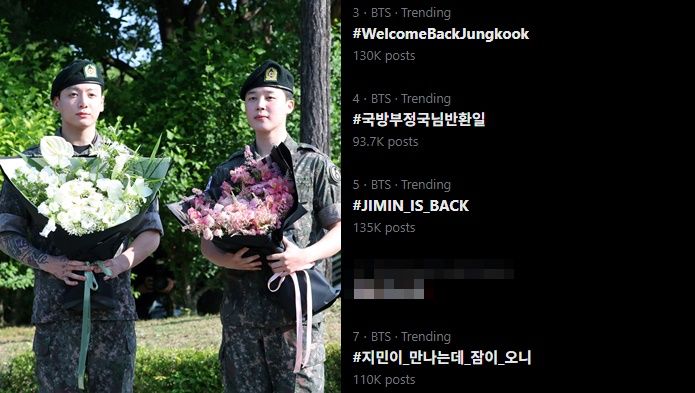 11일 오전부터 소셜미디어(SNS) ‘엑스(X 구 트위터)’ 실시간 트렌드 상위권에는 ‘#지민이_만나는데_잠이_오니’, ‘#국방부정국님반환일’, ‘#WelcomeBackJungkook’, ‘#JIMIN_IS_BACK’, ‘JK & Jimin’ 등 해시태그가 올라와 팬들의 열띤 환영 분위기를 보여줬다.