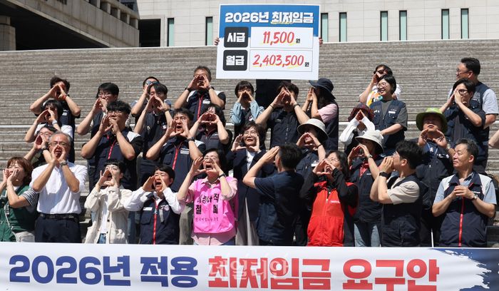 한국노동조합총연맹과 전국민주노동조합총연맹 등 양대 노총과 시민단체는 11일 서울 세종문화회관 앞에서 기자회견을 열고 2026년 적용 최저임금 요구안을 발표했다.