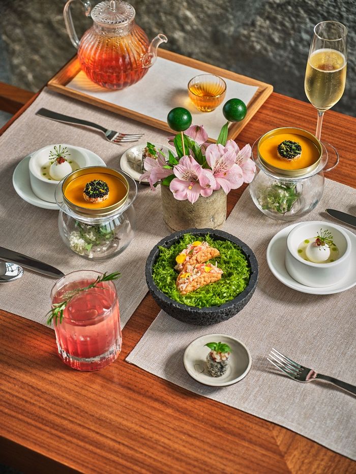 ▲랍스터와 망고를 유자 아이올리로 버무려 타르타르로 완성하고, 아브루가 캐비어를 풍성하게 올려 시원한 망고 가스파초와 함께 제공하는 메뉴를 비롯해, 토마토 워터 위에 부라타 토마토 잼 볼과 베리 발사믹 펄, 바질 오일을 더한 ▲토마토 카프레제는 한입에 샐러드의 조화를 느낄 수 있게 한다.