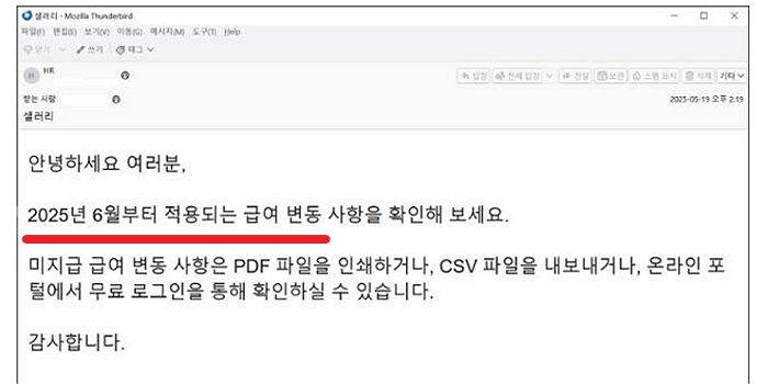 급여 변동 안내로 위장한 피싱 메일. ⓒ안랩 제공
