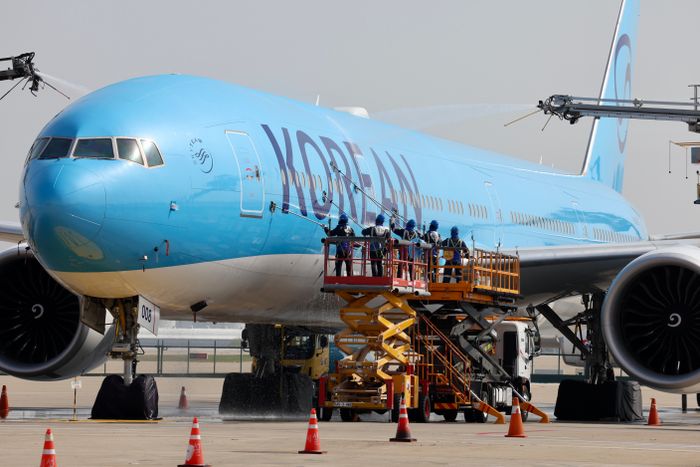4월 24일 오전 인천국제공항에 위치한 대한항공 정비 격납고에서 관계자들이 봄맞이 항공기 동체 세척을 하고 있다. ⓒ뉴시스